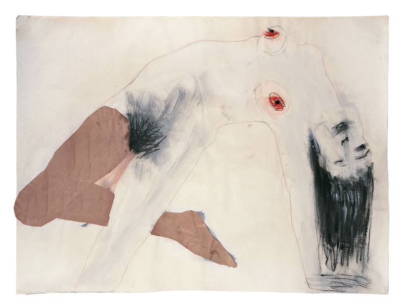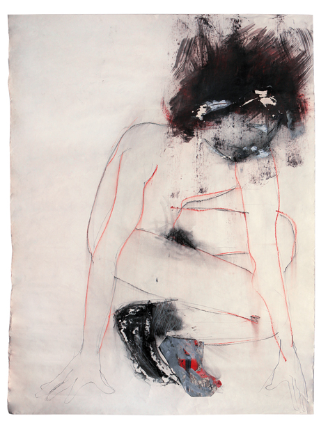 “Accovacciata” 77×97 cm. Acrilico, collage e carboncino su carta.
